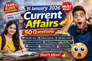 ৩১ জানুয়ারি ২০২৬-এর কারেন্ট অ্যাফেয়ার্স থেকে তৈরি করা ৫০টি গুরুত্বপূর্ণ MCQ প্রশ্ন ও উত্তর সম্পূর্ণ বাংলা ভাষায় দেওয়া হলো—যা SSC, Banking, Railway, State PSC ও অন্যান্য প্রতিযোগিতামূলক পরীক্ষার জন্য উপযোগী।